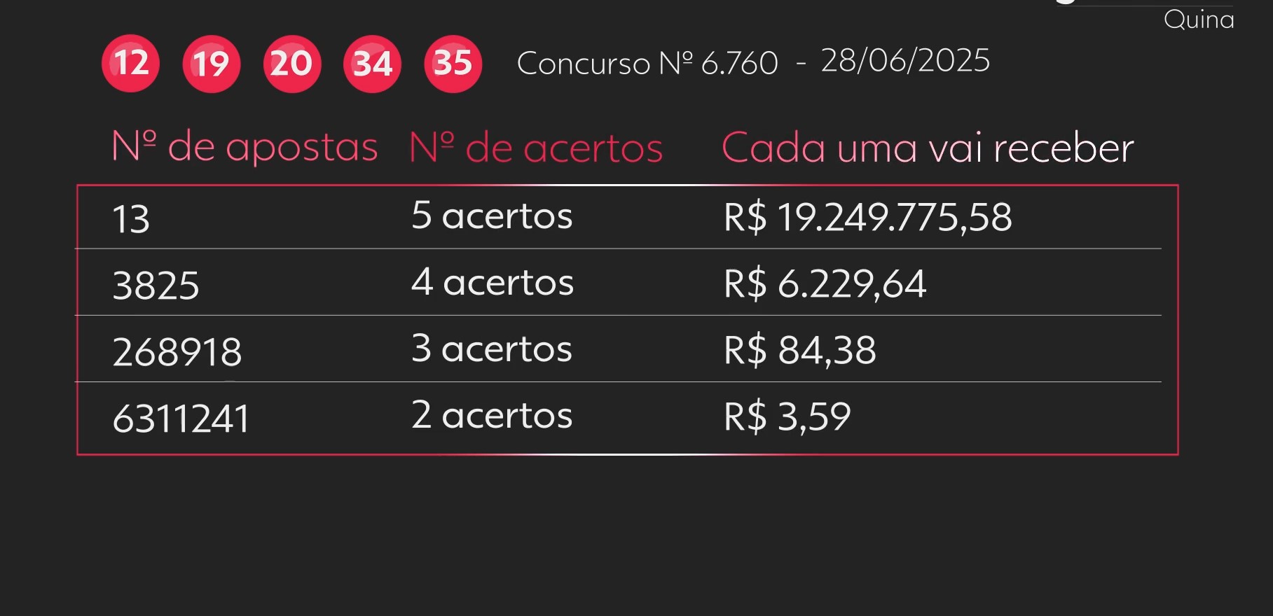 No total, as 13 apostas acertaram as cinco dezenas e dividiram o prêmio total de mais de R$ 250 milhões. As dezenas sorteadas no sorteio do concurso 6760 foram: 35 – 19 – 20 – 34 – 12.