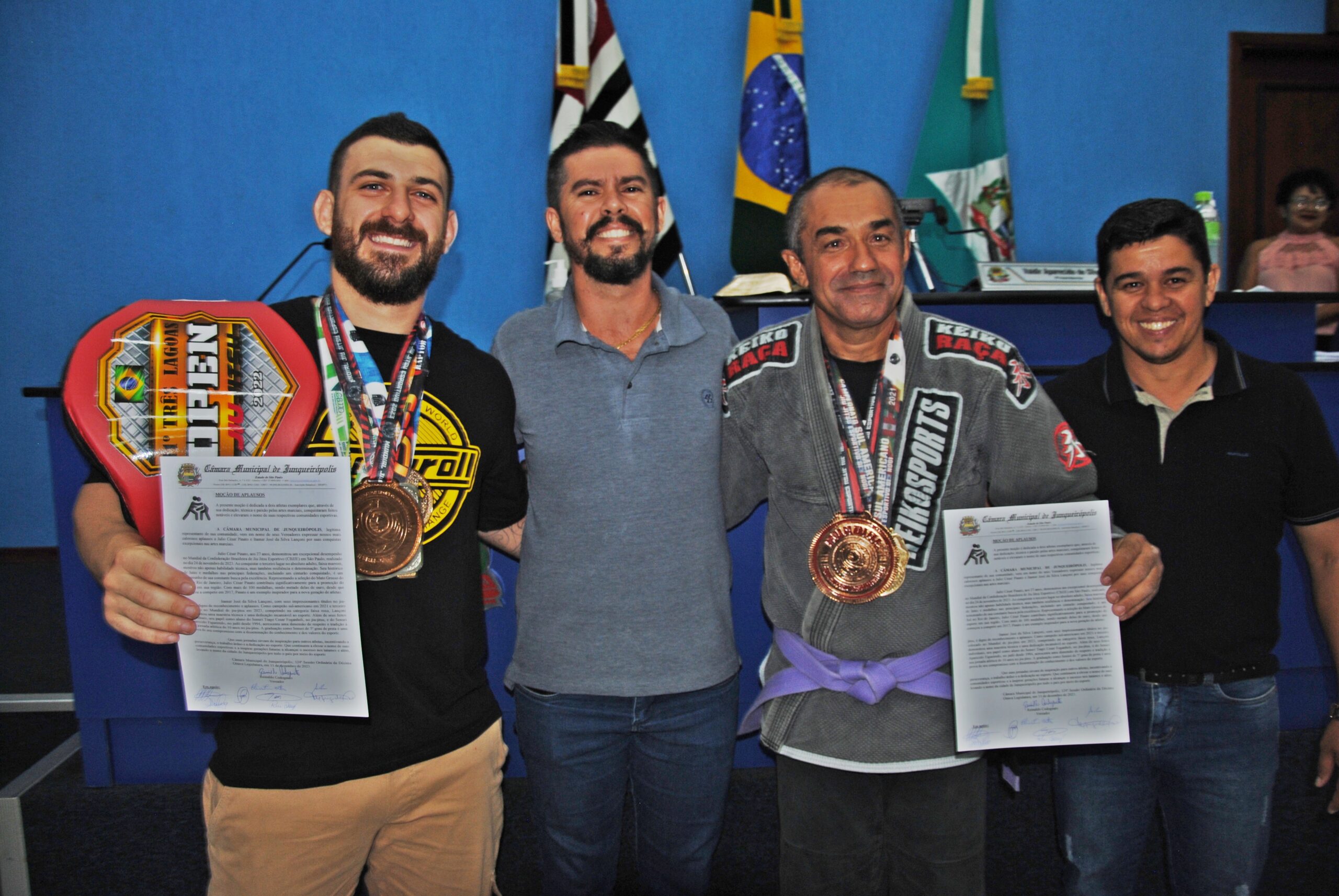 Os atletas de Jiu-Jitsu, Júlio César Pinato e Itamar José da Silva, foram homenageados pela Câmara de Junqueirópolis na sessão de segunda-feira (11) com Moção de Aplausos, “por reconhecimento da dedicação e técnica de ambos nas artes marciais, conquistando feitos que elevaram o nome da cidade no esporte”.