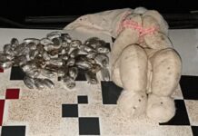 Durante a ação, a cadela farejadora Ravenna, do canil do 8° BAEP da Polícia Militar de Presidente Prudente (SP), localizou porções de drogas escondidas no interruptor de energia.