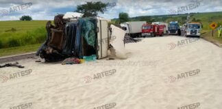 Carreta carregada de arroz tomba após motorista tentar ultrapassagem proibida em...