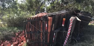 Caminhão com carga de tijolos tomba fora da pista da Rodovia...