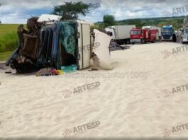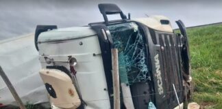 Carreta carregada de arroz tomba após motorista tentar ultrapassagem proibida em rodovia de Martinópolis