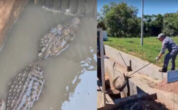 Jacaré preso em encanamento de esgoto mobiliza resgate em Salmourão