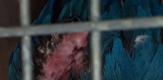 Com lesão provavelmente provocada por linha cortante, arara-canindé é resgatada em...