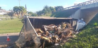 Caminhão da Prefeitura carregado de sucata tomba no trevo de acesso...