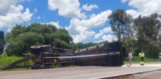 Carreta carregada de arroz tomba após motorista tentar ultrapassagem proibida em rodovia de Martinópolis