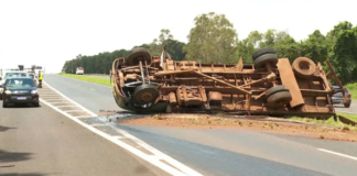 Tombamento de caminhão bloqueia trânsito em rodovia e deixa motorista ferido...