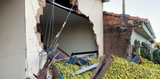 Caminhão carregado com laranjas perde freio e atinge casas no interior...