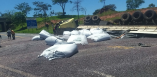 Carreta tomba no trevo entre duas rodovias perto de Parapuã