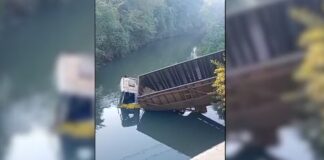 Caminhão cai no Rio Bauru e interdita rodovia em Pederneiras