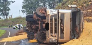 Carreta carregada com milho tomba na Rodovia Euclides de Oliveira Figueiredo,...