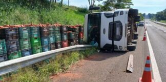 Caminhão carregado de batata-doce tomba na Rodovia Raposo Tavares, em Álvares...
