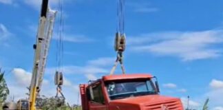 Guindastes retiram caminhão que tombou com carga de soja em ponte,...