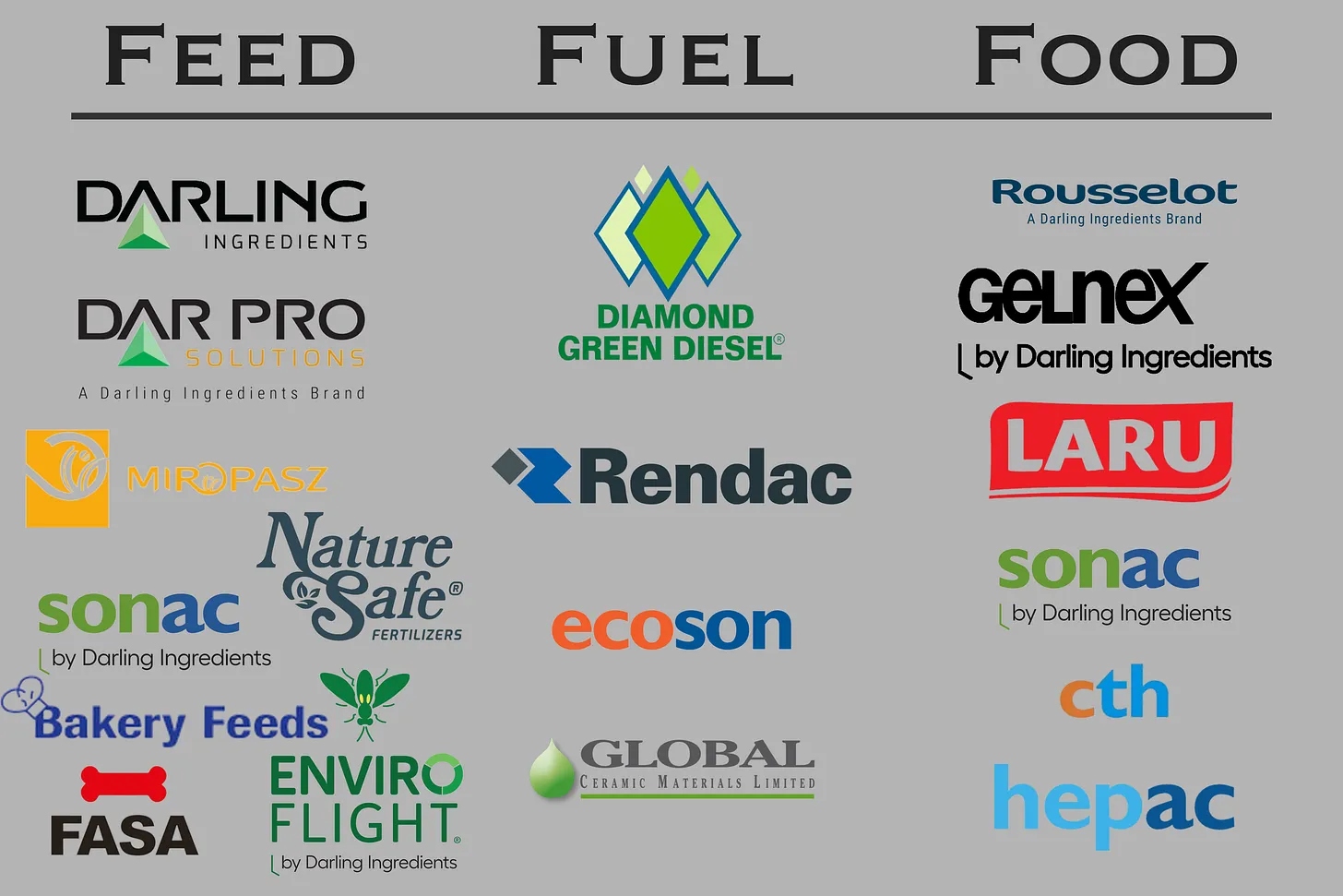 - O segmento de fuel ingredients inclui, nos Estados Unidos, a coleta e o processamento de óleo de cozinha e, na Europa, a produção de gás e energia renovável a partir de sobras de alimentos. As atividades da Darling nesse segmento incluem sua participação detida na joint venture Diamond Green Diesel Holdings LLC, localizada nos Estados Unidos.