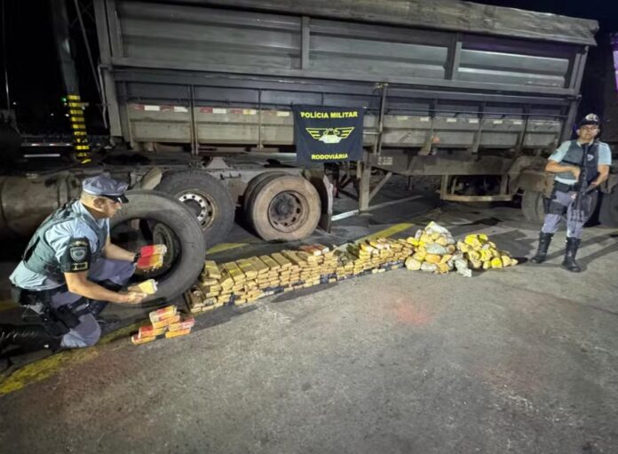De acordo com a Polícia Militar Rodoviária, as equipes abordaram um conjunto de carga suspeito, composto por um trator atrelado a dois semi-reboques do tipo basculante, e, durante a vistoria, perceberam um carregamento de drogas escondido dentro de quatro pneus.