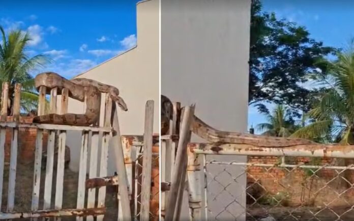 jiboia de três metros enrolada em portão é resgatada por salva-vidas em Panorama (SP) — Foto: Reprodução/Paulo Lima