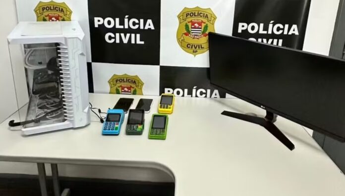 Foram apreendidos telefones celulares, computadores e máquinas de cartões.