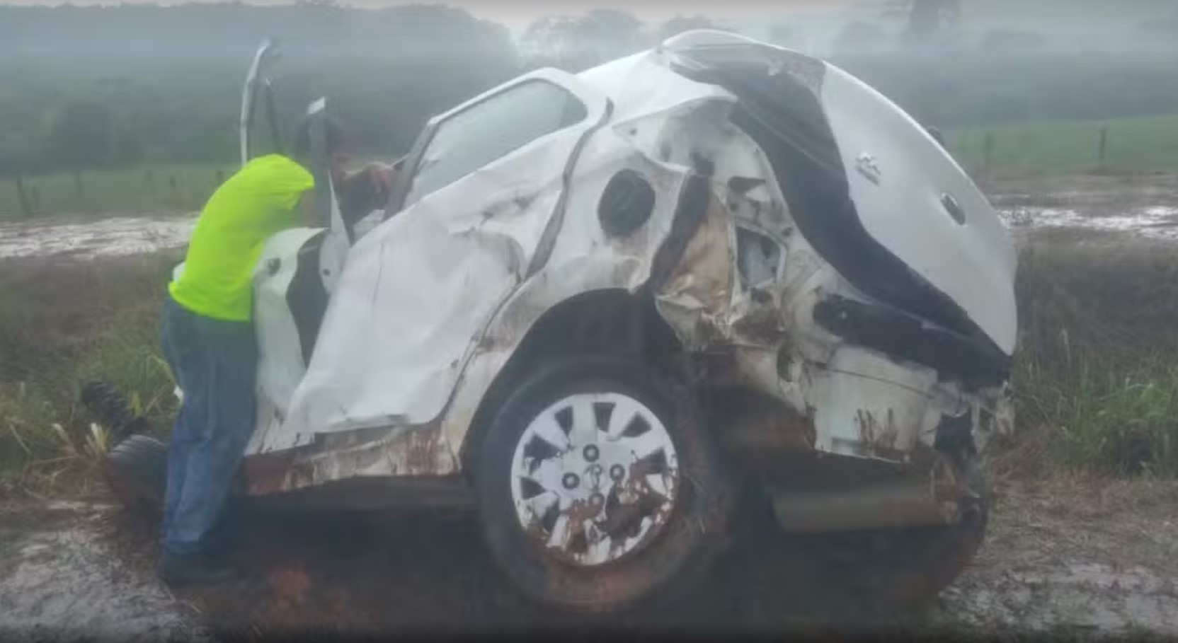O motorista de um veículo perdeu o controle da direção, capotou, foi arremessado e caiu dentro de uma poça d’água durante a chuva desta terça-feira (24) na rodovia Péricles Belini (SP-461) em Votuporanga (SP).