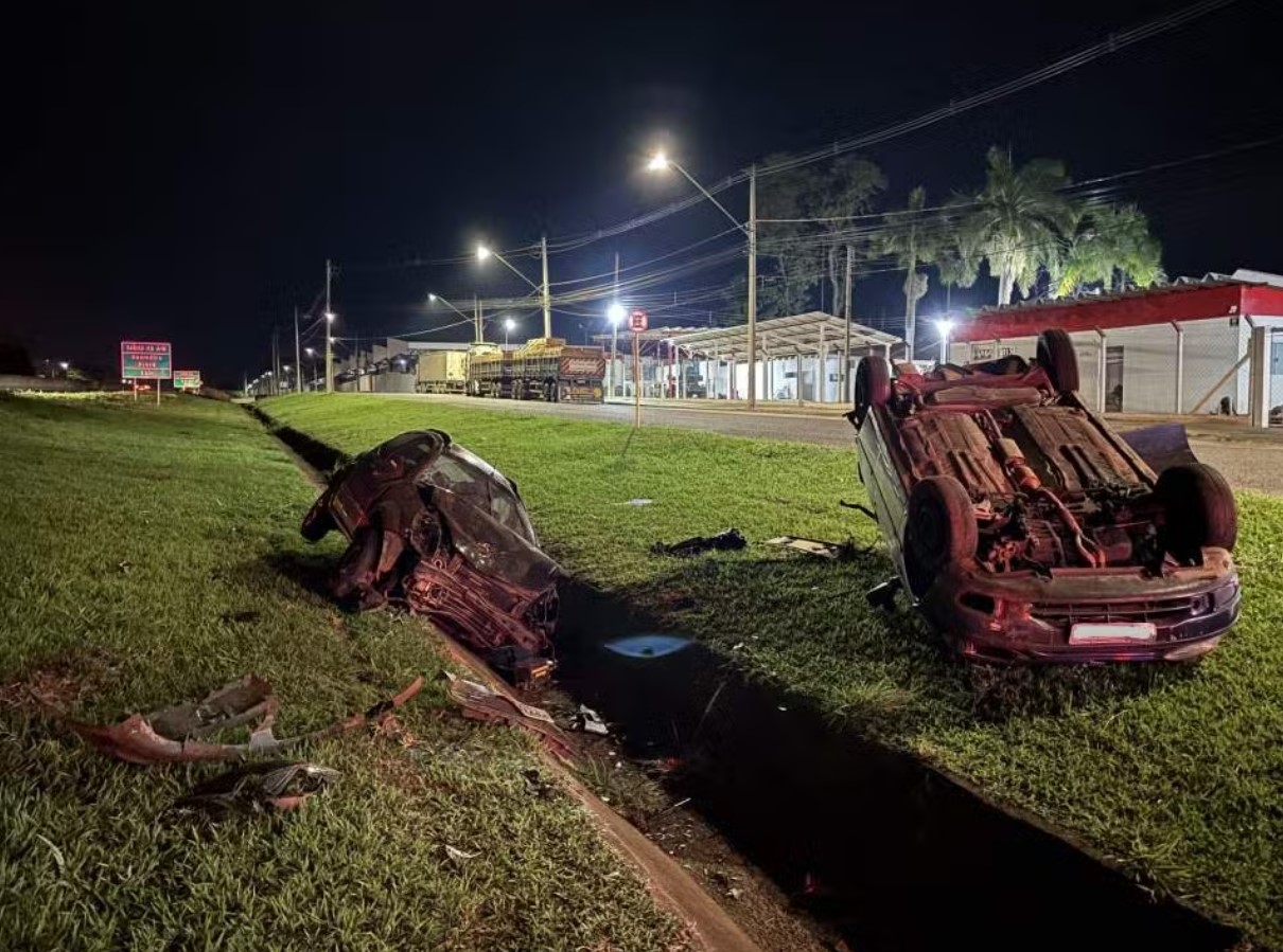 Imagens de câmera de segurança mostram o momento em que o motorista bate na traseira do carro, que era dirigido pela mulher. Com o impacto, os veículos são lançados para o canteiro lateral e capotam várias vezes.