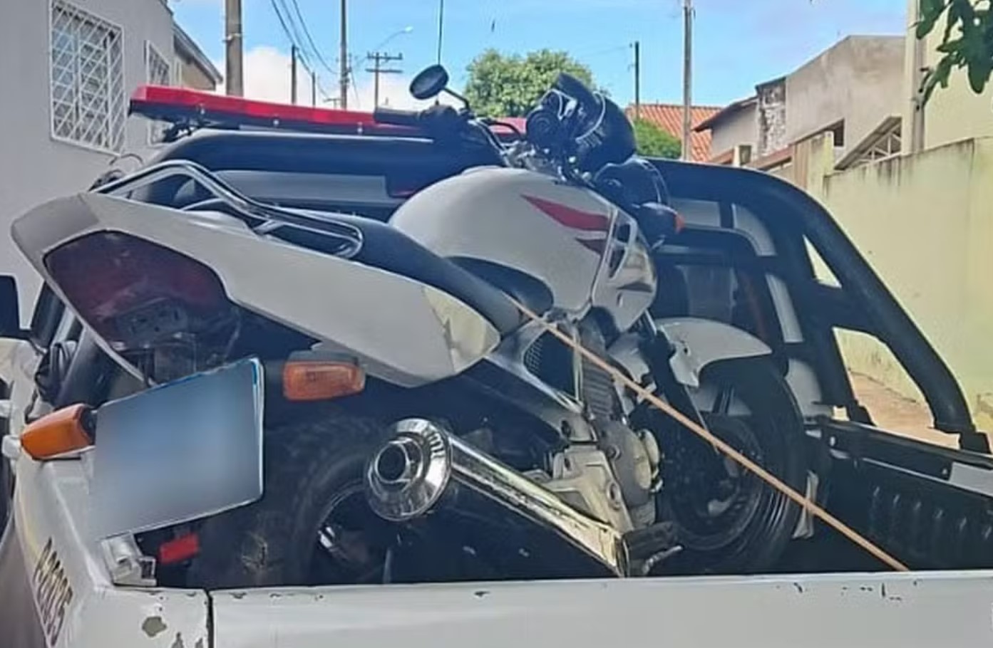 No interior da casa, foi localizada uma motocicleta com sinais de adulteração, que possuía duas placas de identificação sobrepostas.
