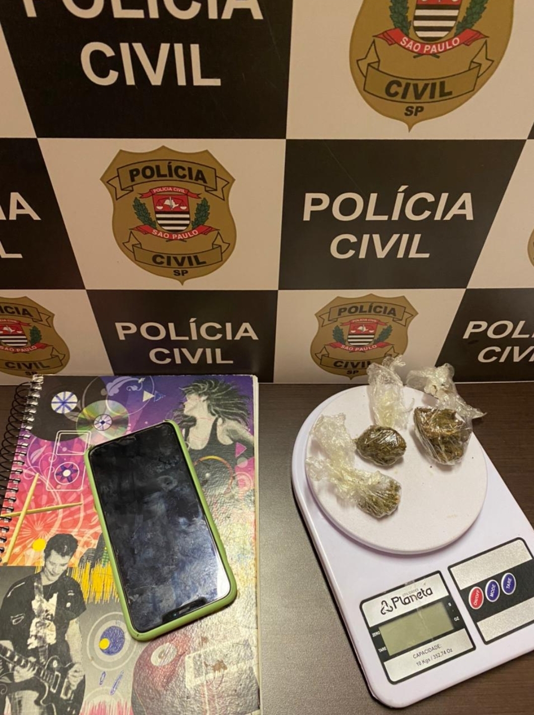 Sob a responsabilidade do preso, hoje foram apreendidas três porções de maconha, uma balança, um caderno de anotações e um aparelho celular.