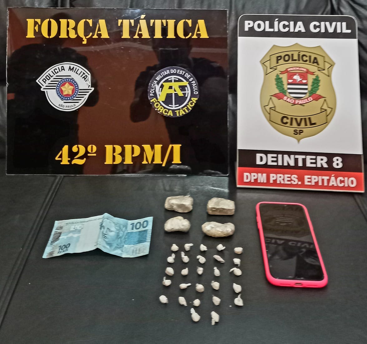 No imóvel localizado na Vila Palmira foram encontradas 31 (trinta e uma) porções de crack, R$ 100,00 (cem reais) em espécie e 1 (um) aparelho celular. J. P. S. S., homem, com 27 anos de idade, foi conduzido até a Delegacia de Polícia de Presidente Epitácio. Em solo policial, o Delegado de Polícia deliberou, ante os elementos de informação que lhe foram apresentados, por decretar a prisão em flagrante do suspeito pela prática do crime de tráfico de drogas.