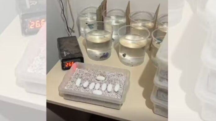 Segundo a Polícia Militar Ambiental, os agentes cumpriram um mandado de busca e apreensão em uma residência, onde também encontraram 264 ovos da mesma espécie, que estavam armazenados em uma incubadora artesanal.