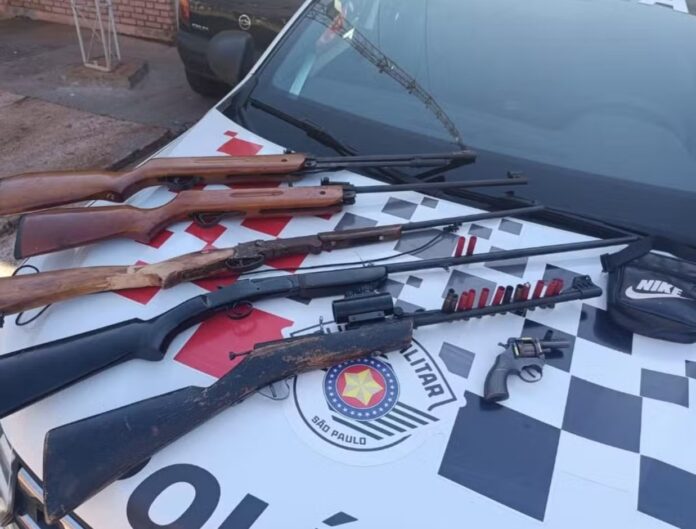 De acordo com os policiais, foram localizadas cinco espingardas, duas aparentemente artesanais, um simulacro de revólver de calibre 22 e diversas munições intactas e deflagradas.