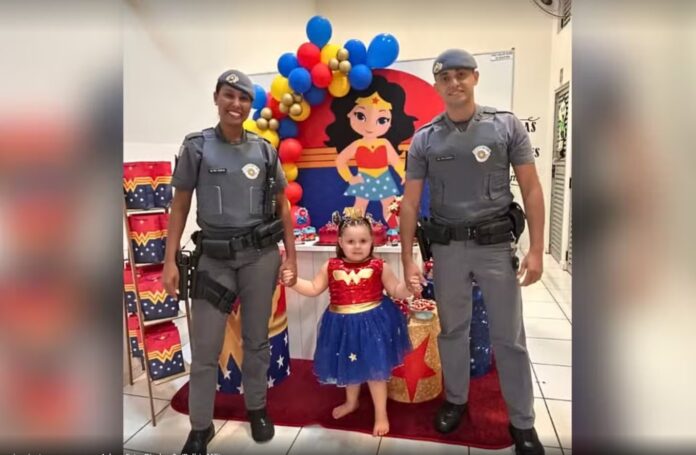 Vestida como Mulher-Maravilha, Ayla já contagiava os convidados com seu “superpoder” de espalhar felicidade, até receber reforços especiais: a Polícia Militar.