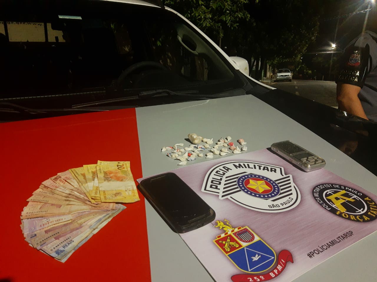 Em patrulhamento de Força Tática pelo município de Paulicéia, foi abordado um individuo  de 21 anos que escondia em suas vestes (bolsos) um recipiente plástico contendo várias porções de crack, já fragmentadas, embaladas e prontas para o comércio.
