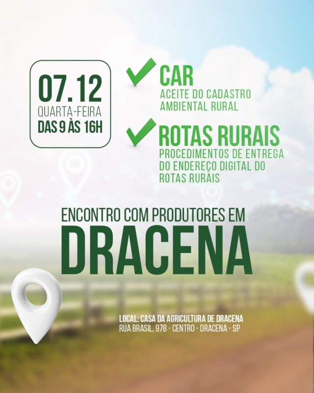 A Secretaria do Agronegócio e a CATI promovem nesta quarta-feira, 7, das 9h às 16h, encontro com produtores em Dracena. Será na Casa da Agricultura, sede do Agronegócio (Rua Brasil, 978, Centro).