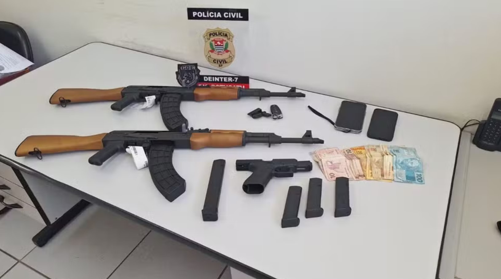 Segundo a Polícia Civil, no momento da prisão, eles tentavam comprar dois fuzis AK-47 em uma loja de armas da cidade usando documentos falsificados.